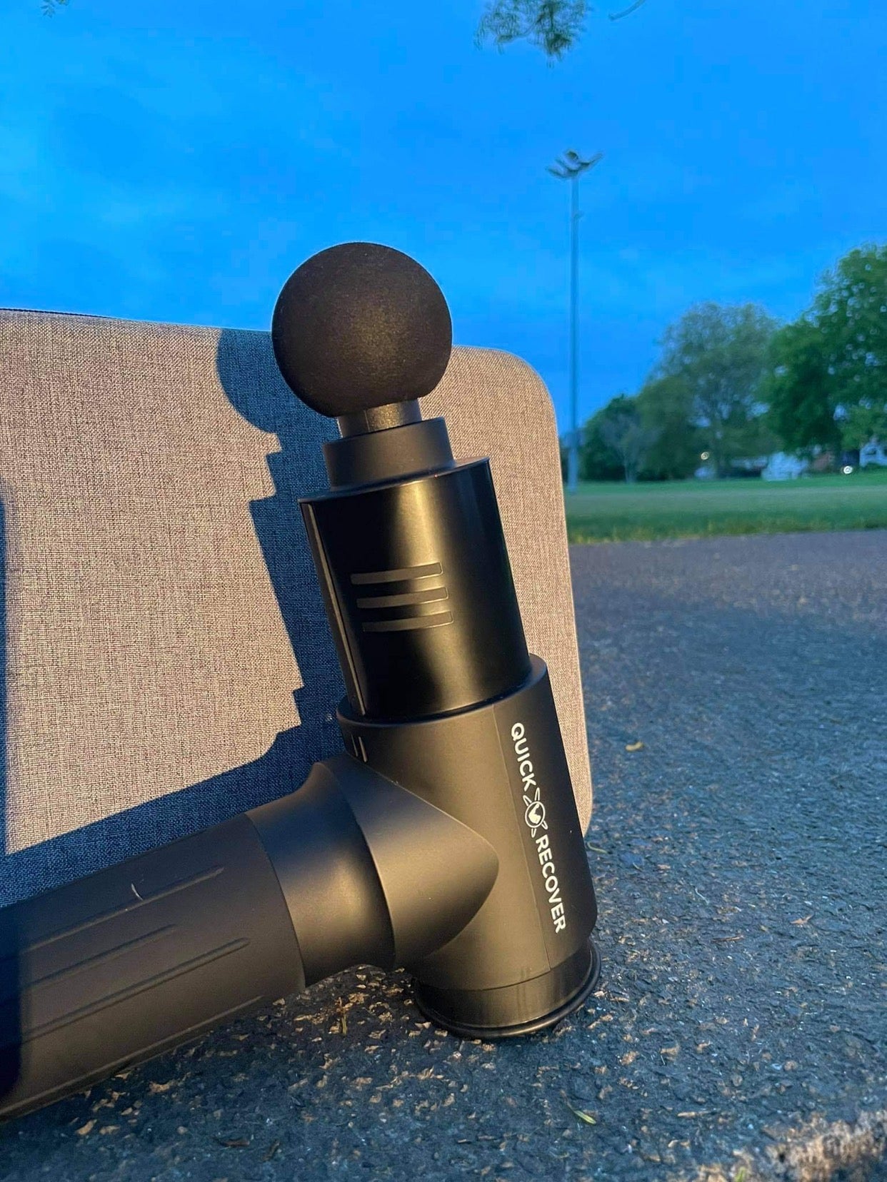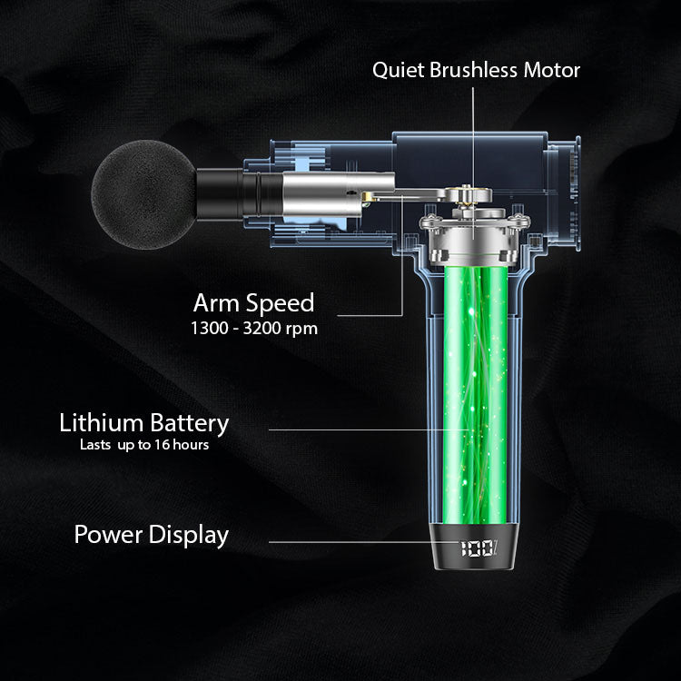 Our massage gun is very portable, weighing less than 1KG, and has a battery life of up to 16hrs. It comes with its own case that fits the massage gun and eight massage heads.